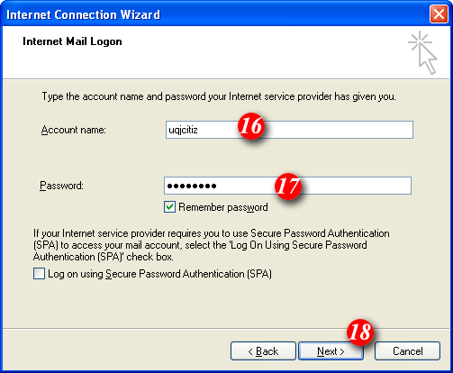 | 16)By default Outlook 2000 will enter part of your email address as the username. Delete this information and enter your 'email address' (for example: me@mydomain.com). | |||||