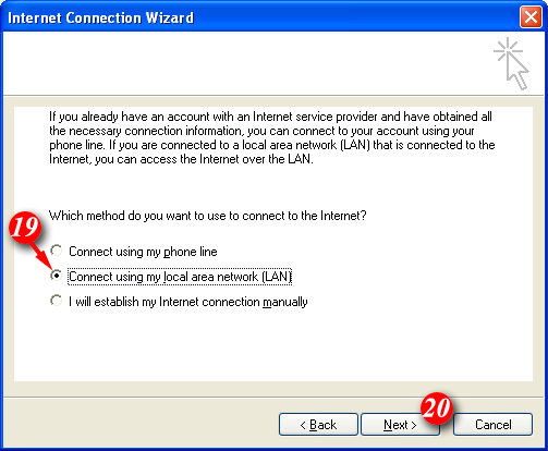 | 19)Select 'Connect using my local area network (LAN)' option. It is advisable to choose this option even if you connect to the Internet using a dialup connection. | |||||