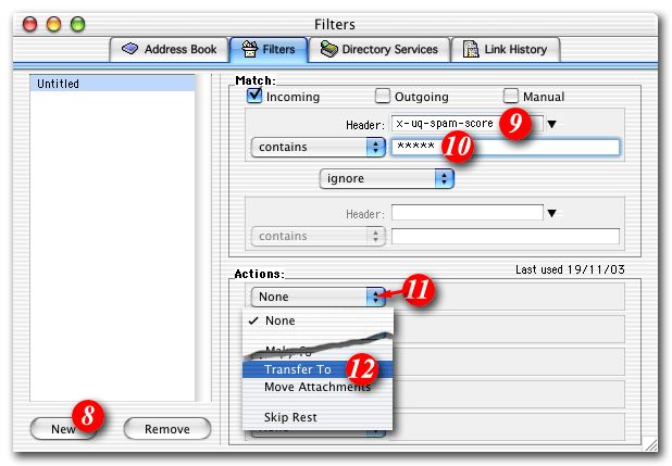 For example, if you wanted to consider anything with a score of 3 or more to be spam, the rule would look like: 'X-SpamDetect: ***'. Decreasing the number of asterisks will result in classifying more e-mails as spam. You may need to check your spam folder more carefully for non-spam e-mails that might have been classified as spam. If you wanted to rate anything with a score of 8 or greater as spam, the rule would look like: 'X-SpamDetect: ********'. Increasing the number of asterisks may result in fewer filtered e-mails being classified as spam and more potential spam staying in your Inbox.